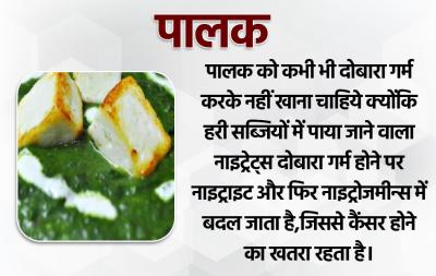 पालक को कभी भी दोबारा गर्म करके नहीं खाना चाहिये क्योंकि हरी सब्जियों में पाया जाने वाला नाइट्रेट्स दोबारा गर्म होने पर नाइट्राइट और फिर नाइट्रोजमीन्स में बदल जाता है,जिससे कैंसर होने का खतरा रहता है।
