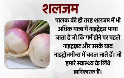 पालक की ही तरह शलजम में भी अधिक मात्रा में नाइट्रेट्स पाया जाता है जो कि गर्म होने पर पहले नाइट्राइट और उसके बाद नाइट्रोजमीन्स में बदल जाते हैं। जो हमारे स्वास्थ्य के लिये हानिकारक हैं।