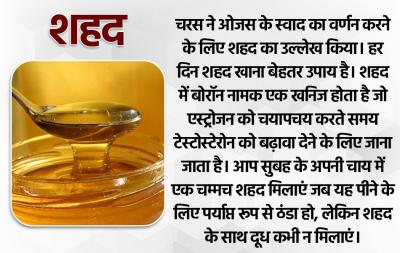 चरस ने ओजस के स्वाद का वर्णन करने के लिए शहद का उल्लेख किया। हर दिन शहद खाना बेहतर उपाय है। शहद में बोरॉन नामक एक खनिज होता है जो एस्ट्रोजन को चयापचय करते समय टेस्टोस्टेरोन को बढ़ावा देने के लिए जाना जाता है। आप सुबह के अपनी चाय में एक चम्मच शहद मिलाएं जब यह पीने के लिए पर्याप्त रूप से ठंडा हो, लेकिन शहद के साथ दूध कभी न मिलाएं।