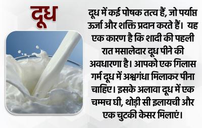 दूध में कई पोषक तत्व हैं, जो पर्याप्त ऊर्जा और शक्ति प्रदान करते हैं। यह एक कारण है कि शादी की पहली रात मसालेदार दूध पीने की अवधारणा है। आपको एक गिलास गर्म दूध में अश्वगंधा मिलाकर पीना चाहिए। इसके अलावा दूध में एक चम्मच घी, थोड़ी सी इलायची और एक चुटकी केसर मिलाएं।