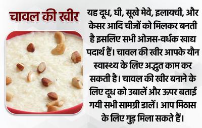 यह दूध, घी, सूखे मेवे, इलायची, और केसर आदि चीजों को मिलकर बनती है इसलिए सभी ओजस-वर्धक खाद्य पदार्थ हैं। चावल की खीर आपके यौन स्वास्थ्य के लिए अद्भुत काम कर सकती है। चावल की खीर बनाने के लिए दूध को उबालें और ऊपर बताई गयी सभी सामग्री डालें। आप मिठास के लिए गुड़ मिला सकते हैं।