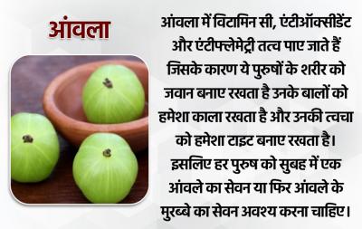 आंवला में विटामिन सी, एंटीऑक्सीडेंट और एंटीफ्लेमेट्री तत्व पाए जाते हैं जिसके कारण ये पुरुषों के शरीर को जवान बनाए रखता है उनके बालों को हमेशा काला रखता है और उनकी त्वचा को हमेशा टाइट बनाए रखता है। इसलिए हर पुरुष को सुबह में एक आंवले का सेवन या फिर आंवले के मुरब्बे का सेवन अवश्य करना चाहिए।
