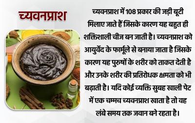 च्यवनप्राश में 108 प्रकार की जड़ी बूटी मिलाए जाते हैं जिसके कारण यह बहुत ही शक्तिशाली चीज बन जाती है। च्यवनप्राश को आयुर्वेद के फार्मूले से बनाया जाता है जिसके कारण यह पुरुषों के शरीर को ताकत देती है और उनके शरीर की प्रतिरोधक क्षमता को भी बढ़ाती है। यदि कोई व्यक्ति सुबह खाली पेट में एक चम्मच च्यवनप्राश खाता है तो वह लंबे समय तक जवान बने रहता है।