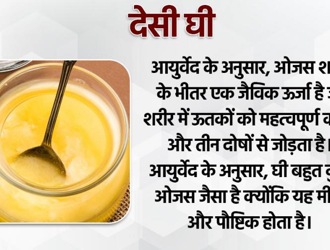 आयुर्वेद के अनुसार, ओजस शरीर के भीतर एक जैविक ऊर्जा है जो शरीर में ऊतकों को महत्वपूर्ण कार्यों और तीन दोषों से जोड़ता है। आयुर्वेद के अनुसार, घी बहुत कुछ ओजस जैसा है क्योंकि यह मीठा और पौष्टिक होता है।