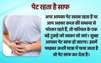 अगर आपका पेट खराब रहता है या आप अक्सर कब्ज की समस्या से परेशान रहते हैं, तो नारियल के एक बड़े टुकड़े को खाकर सो जाएं। सुबह आपका पेट साफ हो जाएगा। इसमें फाइबर अच्छी मात्रा में पाया जाता है जो पेट साफ कर देता है।