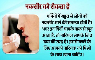 गर्मियों में बहुत से लोगों को नकसीर आने की समस्या होती है। अगर इन दिनों आपके नाक से खून आता है, तो नारियल आपके लिए दवा की तरह है। इससे बचने के लिए आपको नारियक को मिश्री के साथ खाना चाहिए।