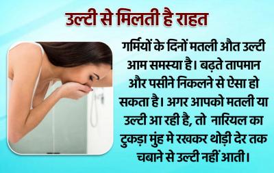 गर्मियों के दिनों मतली औत उल्टी आम समस्या है। बढ़ते तापमान और पसीने निकलने से ऐसा हो सकता है। अगर आपको मतली या उल्टी आ रही है, तो नारियल का टुकड़ा मुंह मे रखकर थोड़ी देर तक चबाने से उल्टी नहीं आती।