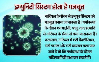 नारियल के सेवन से इम्यून सिस्टम को मजबूत बनाया जा सकता है। गर्भावस्था के दौरान एचआईवी, फ्लू, दाद इत्यादि से नारियल के सेवन से बचा जा सकता है। दरअसल, नारियल में एंटी बैक्टीरियल, एंटी फंगल और एंटी वायरल तत्व पाए जाते हैं जो कि गर्भावस्था के दौरान महिलाओं की रक्षा कर सकते हैं।
