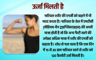 नारियल शरीर की एनर्जी को बढ़ाने में भी मदद करता है। नारियल के तेल में एमटीसी (मीडियम-चैन ट्राइग्लिसराइड्स) की अच्छी मात्रा होती है जो कि अन्य फैटी खाने की अपेक्षा अधिक मात्रा में शरीर की एनर्जी को बढ़ाता है। शोध से पता चला है कि एक दिन में 15 से 30 ग्राम नारियल खाने से शरीर को 120 कैलोरी उर्जा मिलती है।