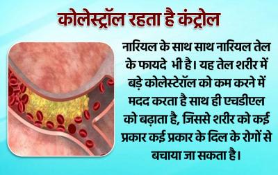 नारियल के साथ साथ नारियल तेल के फायदे भी है। यह तेल शरीर में बड़े कोलेस्टेरॉल को कम करने में मदद करता है साथ ही एचडीएल को बढ़ाता है, जिससे शरीर को कई प्रकार कई प्रकार के दिल के रोगों से बचाया जा सकता है।
