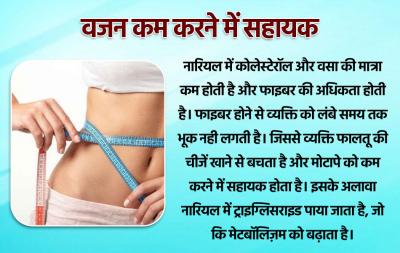 नारियल में कोलेस्टेरॉल और वसा की मात्रा कम होती है और फाइबर की अधिकता होती है। फाइबर होने से व्यक्ति को लंबे समय तक भूक नही लगती है। जिससे व्यक्ति फालतू की चीजें खाने से बचता है और मोटापे को कम करने में सहायक होता है। इसके अलावा नारियल में ट्राइग्लिसराइड पाया जाता है, जो कि मेटबॉलिज़म को बढ़ाता है।