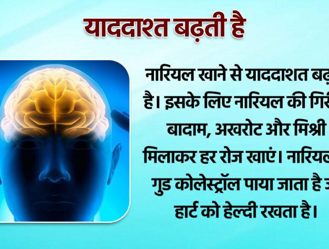 नारियल खाने से याददाशत बढ़ती है। इसके लिए नारियल की गिरी में बादाम, अखरोट और मिश्री मिलाकर हर रोज खाएं। नारियल में गुड कोलेस्ट्रॉल पाया जाता है जो हार्ट को हेल्दी रखता है।