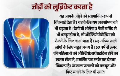 यह आपके जोड़ों को स्वाभाविक रूप से चिकनाई देता है। यह कैल्शियम अवशोषण को भी बढ़ाता है। देसी घी ओमेगा 3 फैटी एसिड से भी भरपूर होता है, जो ऑस्टियोपोरोसिस को रोकने के लिए जाना जाता है। यह गठिया वाले लोगों के लिए बहुत अच्छा है। 50 वर्ष से ऊपर की महिलाओं को ऑस्टियोआर्थराइटिस होने का खतरा होता है, इसलिए यह उनके यह बेहतर विकल्प है। कंकाल प्रणाली को मजबूत और फिट बनाने के लिए घी खाएं।