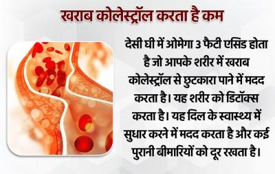 देसी घी में ओमेगा 3 फैटी एसिड होता है जो आपके शरीर में खराब कोलेस्ट्रॉल से छुटकारा पाने में मदद करता है। यह शरीर को डिटॉक्स करता है। यह दिल के स्वास्थ्य में सुधार करने में मदद करता है और कई पुरानी बीमारियों को दूर रखता है।