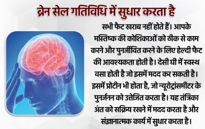 सभी फैट खराब नहीं होते हैं। आपके मस्तिष्क की कोशिकाओं को ठीक से काम करने और पुनर्जीवित करने के लिए हेल्दी फैट की आवश्यकता होती है। देसी घी में स्वस्थ वसा होती है जो इसमें मदद कर सकती है। इसमें प्रोटीन भी होता है, जो न्यूरोट्रांसमीटर के पुनर्जनन को उत्तेजित करता है। यह तंत्रिका अंत को सक्रिय रखने में मदद करता है और संज्ञानात्मक कार्य में सुधार करता है।