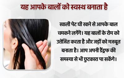 खाली पेट घी खाने से आपके बाल चमकने लगेंगे। यह बालों के रोम को उत्तेजित करता है और जड़ों को मजबूत बनाता है। आप अपनी डैंड्रफ की समस्या से भी छुटकारा पा सकेंगे।