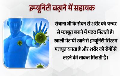 रोजाना घी के सेवन से शरीर को अन्दर से मजबूत बनाने में मदद मिलती है। खाली पेट घी खाने से इम्यूनिटी सिस्टम मजबूत बनता है और शरीर को रोगों से लड़ने की ताकत मिलती है।
