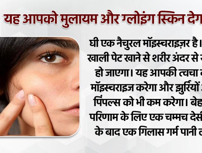 घी एक नैचुरल मॉइस्चराइज़र है। इसे खाली पेट खाने से शरीर अंदर से साफ हो जाएगा। यह आपकी त्वचा को मॉइस्चराइज करेगा और झुर्रियों और पिंपल्स को भी कम करेगा। बेहतर परिणाम के लिए एक चम्मच देसी घी के बाद एक गिलास गर्म पानी लें।