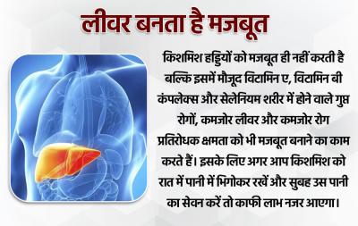 किशमिश में मौजूद विटामिन ए, विटामिन बी कंपलेक्स और सेलेनियम शरीर में होने वाले गुप्त रोगों, कमजोर लीवर और कमजोर रोग प्रतिरोधक क्षमता को भी मजबूत बनाने का काम करते हैं। इसके लिए अगर आप किशमिश को रात में पानी में भिगोकर रखें और सुबह उस पानी का सेवन करें तो काफी लाभ नजर आएगा।