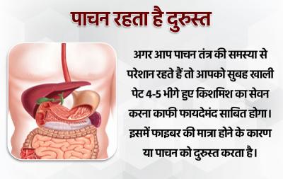 पाचन तंत्र की समस्या से परेशान रहते हैं तो आपको सुबह खाली पेट 4-5 भीगे हुए किशमिश का सेवन करना काफी फायदेमंद साबित होगा। इसमें फाइबर की मात्रा होने के कारण या पाचन को दुरुस्त करता है।