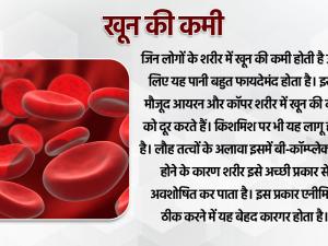 1 / 5शरीर में खून की कमी होती है उनके लिए किशमिश और किशमिश का पानी बहुत फायदेमंद होता है। इसमें मौजूद आयरन और कॉपर शरीर में खून की कमी को दूर करते हैं। किशमिश पर भी यह लागू होता है। लौह तत्वों के अलावा इसमें बी-कॉम्प्लेक्स भी होने के कारण शरीर इसे अच्छी प्रकार से अवशोषित कर पाता है। इस प्रकार एनीमिया ठीक करने में यह बेहद कारगर होता है।2 / 5किशमिश में मौजूद विटामिन ए, विटामिन बी कंपलेक्स और सेलेनियम शरीर में होने वाले गुप्त रोगों, कमजोर लीवर और कमजोर रोग प्रतिरोधक क्षमता को भी मजबूत बनाने का काम करते हैं। इसके लिए अगर आप किशमिश को रात में पानी में भिगोकर रखें और सुबह उस पानी का सेवन करें तो काफी लाभ नजर आएगा।3 / 5किशमिश खाएं और किशमिश को रात भर पानी में भिगोकर रखकर वो पाती पी ले, ऐसा करने से विटामिन ए की कमी पूरी होती है और यह आंखों की रोशनी बढ़ाता है।4 / 5रोज सुबह किशमिश का पानी पीने से शारीरिक कमजोरी और थकान दूर होती है और हमारे शारीर को आराम मिलता है।5 / 5पाचन तंत्र की समस्या से परेशान रहते हैं तो आपको सुबह खाली पेट 4-5 भीगे हुए किशमिश का सेवन करना काफी फायदेमंद साबित होगा। इसमें फाइबर की मात्रा होने के कारण या पाचन को दुरुस्त करता है।