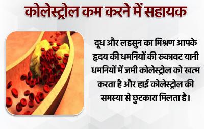 दूध और लहसुन का मिश्रण आपके हृदय की धमनियों की रुकावट यानी धमनियों में जमी कोलेस्ट्रोल को खत्म करता है और हाई कोलेस्ट्रोल की समस्या से छुटकारा मिलता है।