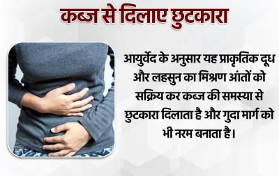 आयुर्वेद के अनुसार यह प्राकृतिक दूध और लहसुन का मिश्रण आंतों को सक्रिय कर कब्ज की समस्या से छुटकारा दिलाता है और गुदा मार्ग को भी नरम बनाता है