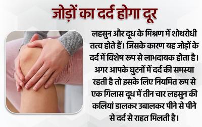 लहसुन और दूध के मिश्रण में शोथरोधी तत्व होते हैं। जिसके कारण यह जोड़ों के दर्द में विशेष रूप से लाभदायक होता है। अगर आपके घुटनों में दर्द की समस्या रहती है तो इसके लिए नियमित रूप से एक गिलास दूध में तीन चार लहसुन की कलियां डालकर उबालकर पीने से पीने से दर्द से राहत मिलती है।