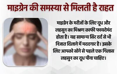 माइग्रेन के मरीजों के लिए दूध और लहसुन का मिश्रण काफी फायदेमंद होता है। यह सामान्य सिर दर्द से भी निजात दिलाने में मददगार है। इसके लिए आपको सोने से पहले एक गिलास लहसुन का दूध पीना चाहिए।