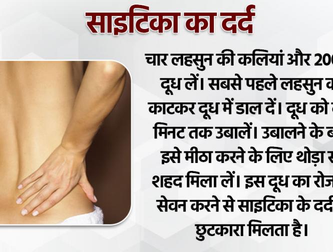 चार लहसुन की कलियां और 200एम दूध लें। सबसे पहले लहसुन को काटकर दूध में डाल दें। दूध को कुछ मिनट तक उबालें। उबालने के बाद इसे मीठा करने के लिए थोड़ा सा शहद मिला लें। इस दूध का रोजाना सेवन करने से साइटिका के दर्द से छुटकारा मिलता है।