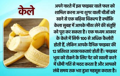 अपने नाश्ते में इस फाइबर वाले फल को शामिल करना अन्य शुगर वाली चीजों को खाने से एक बढ़िया विकल्प है क्योंकि केला सुबह में आपके मीठा लेने की संतुष्टि को पूरा कर सकता है। एक मध्यम आकार के केले में सिर्फ 100 से अधिक कैलोरी होती हैं, लेकिन आपके दैनिक फाइबर की 12 प्रतिशत आवश्यकताएं होती हैं। फाइबर भूख को रोकने के लिए पेट को खाली करने में धीमी गति से मदद करता है और आपको लंबे समय तक भरा हुआ महसूस कराता है।