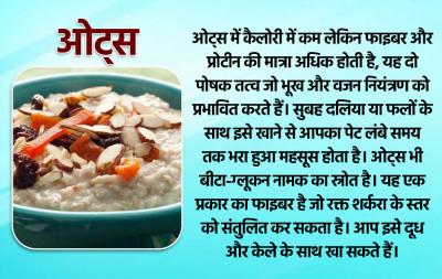 ओट्स में कैलोरी में कम लेकिन फाइबर और प्रोटीन की मात्रा अधिक होती है, यह दो पोषक तत्व जो भूख और वजन नियंत्रण को प्रभावित करते हैं। सुबह दलिया या फलों के साथ इसे खाने से आपका पेट लंबे समय तक भरा हुआ महसूस होता है। ओट्स भी बीटा-ग्लूकन नामक का स्रोत है। यह एक प्रकार का फाइबर है जो रक्त शर्करा के स्तर को संतुलित कर सकता है। आप इसे दूध और केले के साथ खा सकते हैं।