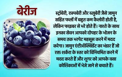 स्ट्रॉबेरी, रास्पबेरी और ब्लूबेरी जैसे जामुन सहित फलों में बहुत कम कैलोरी होती है, लेकिन फाइबर से भरे होते हैं। नाश्ते के साथ इनका सेवन आपको दोपहर के भोजन के समय तक भरपेट महसूस करने में मदद करेगा। जामुन एंटीऑक्सिडेंट का भंडार हैं जो रक्त शर्करा के स्तर को विनियमित करने में मदद करते हैं और शुगर को आपके वसा कोशिकाओं में भेजे जाने से बचाते हैं।