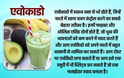 एवोकाडो में स्वस्थ वसा से भरे होते हैं, जिन्हें नाश्ते में खाना वजन कंट्रोल करने का सबसे बेहतर तरीका है। इनमें फाइबर और ओलिक एसिड दोनों होते हैं, जो भूख की भावनाओं को कम करने में मदद करते हैं और आप एवोकैडो को अपने नाश्ते में बहुत आसानी से शामिल कर सकते हैं। आप टोस्ट पर एवोकैडो लगा सकते हैं या आप इसे एक स्मूदी में भी ब्लिट्ज कर सकते हैं जो एक मलाईदार स्वाद बनाता है।
