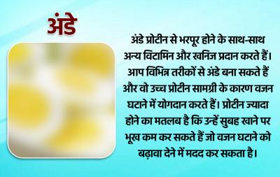 अंडे प्रोटीन से भरपूर होने के साथ-साथ अन्य विटामिन और खनिज प्रदान करते हैं। आप विभिन्न तरीकों से अंडे बना सकते हैं और वो उच्च प्रोटीन सामग्री के कारण वजन घटाने में योगदान करते हैं। प्रोटीन ज्यादा होने का मतलब है कि उन्हें सुबह खाने पर भूख कम कर सकते हैं जो वजन घटाने को बढ़ावा देने में मदद कर सकता है।