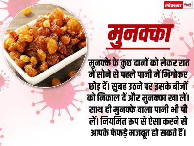 मुनक्के के कुछ दानों को लेकर रात में सोने से पहले पानी में भिगोकर छोड़ दें। सुबह उठने पर इसके बीजों को निकाल दें और मुनक्का खा लें। साथ ही मुनक्के वाला पानी भी पी लें। नियमित रूप से ऐसा करने से आपके फेफड़े मजबूत हो सकते हैं।