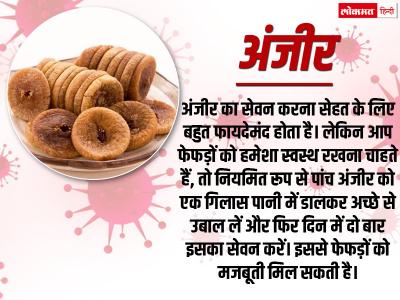 अंजीर का सेवन करना सेहत के लिए बहुत फायदेमंद होता है। लेकिन आप फेफड़ों को हमेशा स्वस्थ रखना चाहते हैं, तो नियमित रूप से पांच अंजीर को एक गिलास पानी में डालकर अच्छे से उबाल लें और फिर दिन में दो बार इसका सेवन करें। इससे फेफड़ों को मजबूती मिल सकती है।