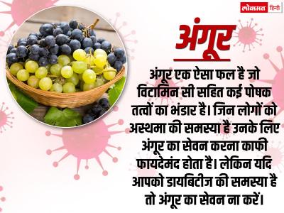 अंगूर एक ऐसा फल है जो विटामिन सी सहित कई पोषक तत्वों का भंडार है। जिन लोगों को अस्थमा की समस्या है उनके लिए अंगूर का सेवन करना काफी फायदेमंद होता है। लेकिन यदि आपको डायबिटीज की समस्या है तो अंगूर का सेवन ना करें।