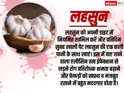 लहसुन को अपनी डाइट में नियमित शामिल करें और प्रतिदिन सुबह खाली पेट लहसुन की एक कली पानी के साथ खाएं। इस में पाए जाने वाला एलीसिन तत्व इंफेक्शन से लड़ने रोग प्रतिरोधक क्षमता बढ़ाने और फेफड़ों को स्वस्थ व मजबूत रखने में बहुत मददगार होता है।