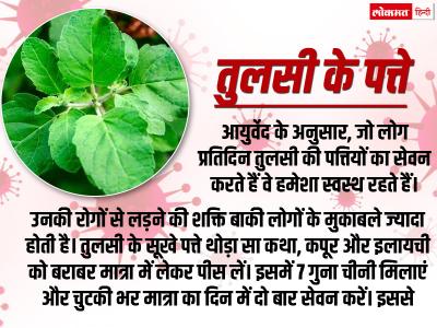आयुर्वेद के अनुसार, जो लोग प्रतिदिन तुलसी की पत्तियों का सेवन करते हैं वे हमेशा स्वस्थ रहते हैं। उनकी रोगों से लड़ने की शक्ति बाकी लोगों के मुकाबले ज्यादा होती है। तुलसी के सूखे पत्ते थोड़ा सा कथा, कपूर और इलायची को बराबर मात्रा में लेकर पीस लें। इसमें 7 गुना चीनी मिलाएं और चुटकी भर मात्रा का दिन में दो बार सेवन करें। इससे फेफड़ों में जमा कफ आसानी से निकल जाता है और फेफड़ों को मजबूती मिलती है।