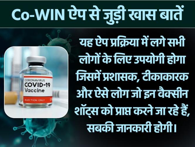 यह ऐप प्रक्रिया में लगे सभी लोगों के लिए उपयोगी होगा जिसमें प्रशासक, टीकाकारक और ऐसे लोग जो इन वैक्सीन शॉट्स को प्राप्त करने जा रहे हैं, सबकी जानकारी होगी।