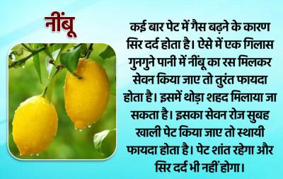 कई बार पेट में गैस बढ़ने के कारण सिर दर्द होता है। ऐसे में एक गिलास गुनगुने पानी में नींबू का रस मिलकर सेवन किया जाए तो तुरंत फायदा होता है। इसमें थोड़ा शहद मिलाया जा सकता है। इसका सेवन रोज सुबह खाली पेट किया जाए तो स्थायी फायदा होता है। पेट शांत रहेगा और सिर दर्द भी नहीं होगा।