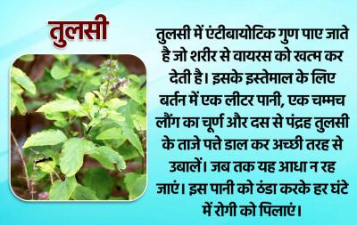 तुलसी में एंटीबायोटिक गुण पाए जाते है जो शरीर से वायरस को खत्म कर देती है। इसके इस्तेमाल के लिए बर्तन में एक लीटर पानी, एक चम्मच लौंग का चूर्ण और दस से पंद्रह तुलसी के ताजे पत्ते डाल कर अच्छी तरह से उबालें। जब तक यह आधा न रह जाएं। इस पानी को ठंडा करके हर घंटे में रोगी को पिलाएं।