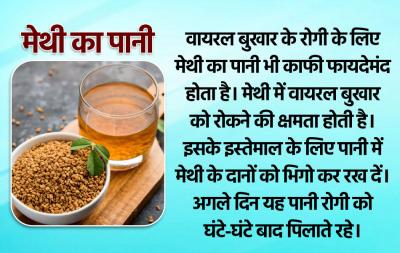 वायरल बुखार के रोगी के लिए मेथी का पानी भी काफी फायदेमंद होता है। मेथी में वायरल बुखार को रोकने की क्षमता होती है। इसके इस्तेमाल के लिए पानी में मेथी के दानों को भिगो कर रख दें। अगले दिन यह पानी रोगी को घंटे-घंटे बाद पिलाते रहे।