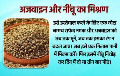 इसे इस्तेमाल करने के लिए एक छोटा चम्मच सफेद नमक और अजवाइन को तब तक भूनें, जब तक इसका रंग न बदल जाएं। अब इसे एक गिलास पानी में मिक्स करें। फिर इसमें नींबू निचोड़ कर दिन में दो या तीन बार पीएं।