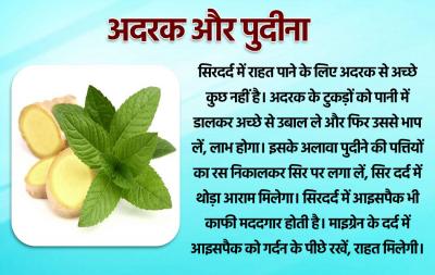 सिरदर्द में राहत पाने के लिए अदरक से अच्छे कुछ नहीं है। अदरक के टुकड़ों को पानी में डालकर अच्छे से उबाल ले और फिर उससे भाप लें, लाभ होगा। इसके अलावा पुदीने की पत्तियों का रस निकालकर सिर पर लगा लें, सिर दर्द में थोड़ा आराम मिलेगा। सिरदर्द में आइसपैक भी काफी मददगार होती है। माइग्रेन के दर्द में आइसपैक को गर्दन के पीछे रखें, राहत मिलेगी।
