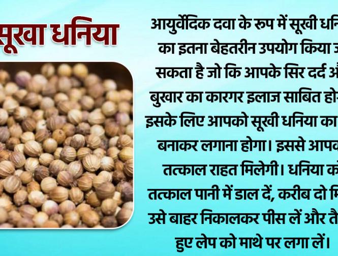 आयुर्वेदिक दवा के रूप में सूखी धनिया का इतना बेहतरीन उपयोग किया जा सकता है जो कि आपके सिर दर्द और बुखार का कारगर इलाज साबित होगी। इसके लिए आपको सूखी धनिया का लेप बनाकर लगाना होगा। इससे आपको तत्काल राहत मिलेगी। धनिया को तत्काल पानी में डाल दें, करीब दो मिनट उसे बाहर निकालकर पीस लें और तैयार हुए लेप को माथे पर लगा लें।