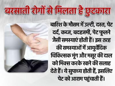 बारिश के मौसम में उल्टी, दस्त, पेट दर्द, कब्ज, बदहजमी, पेट फूलने जैसी समस्याएं होती हैं। इस तरह की समस्याओं में आयुर्वेदिक चिकित्सक मूंग और मसूर की दाल को मिक्स करके खाने की सलाह देते हैं। ये सुपाच्य होती हैं, इसलिए पेट को आराम पहुंचाती हैं।