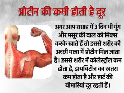 अगर आप सप्ताह में 3 दिन भी मूंग और मसूर की दाल को मिक्स करके खाते हैं तो इससे शरीर को अच्छी मात्रा में प्रोटीन मिल जाता है। इससे शरीर में कोलेस्ट्रॉल कम होता है, डायबिटीज का खतरा कम होता है और हार्ट की बीमारियां दूर रहती हैं।