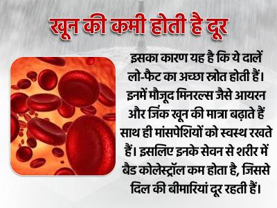 इसका कारण यह है कि ये दालें लो-फैट का अच्छा स्रोत होती हैं। इनमें मौजूद मिनरल्स जैसे आयरन और जिंक खून की मात्रा बढ़ाते हैं साथ ही मांसपेशियों को स्वस्थ रखते हैं। इसलिए इनके सेवन से शरीर में बैड कोलेस्ट्रॉल कम होता है, जिससे दिल की बीमारियां दूर रहती हैं।